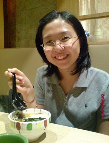 i ordered a Fried Pork Ma-La noodles ($8.9) , a yam milk shake ($4.9), and share a side dish with favian. Noodles, no-big-deal, as what i can get from our SA cafe. Basically, they jus added some curry paste into the soup. really…. NO BIG DEAL! No choice, i wasn’t meant to smile when i taking photo, but it would be too awkward if i take photo with a noodles, somemore with a angry face? like this—>